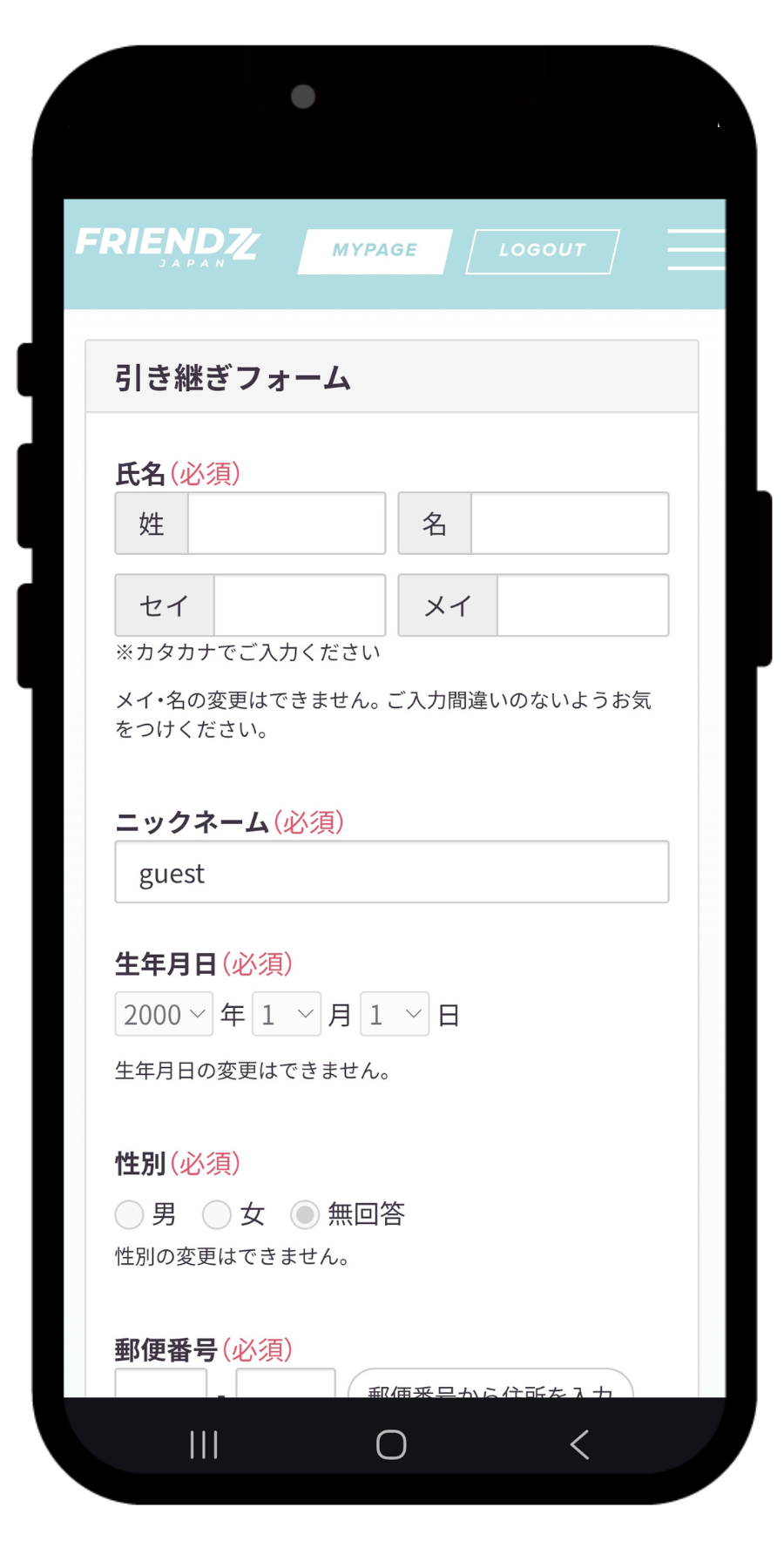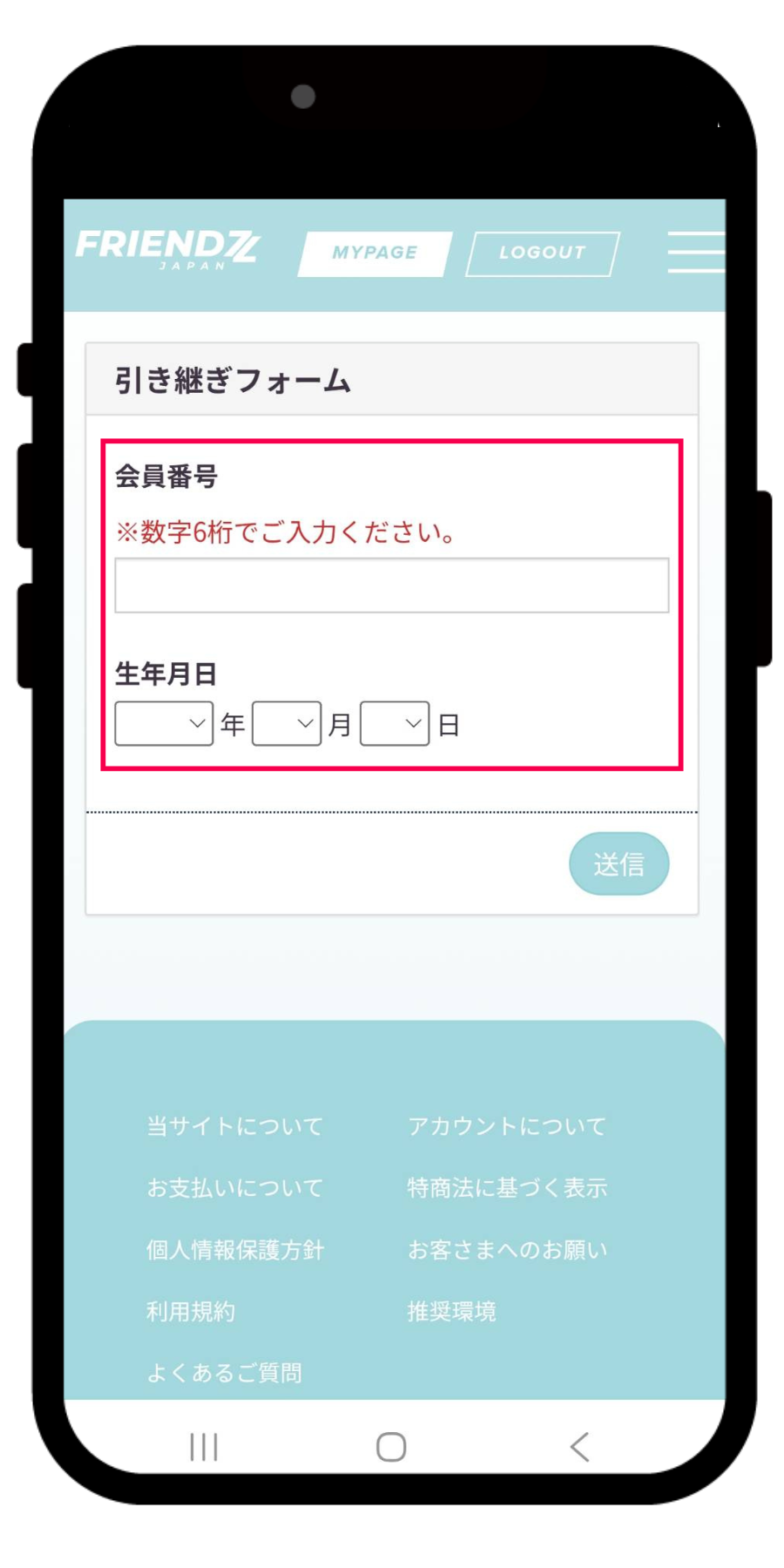 ①リニューアル以前のFC会員番号 ②生年月日 を入力し、ご送信ください。